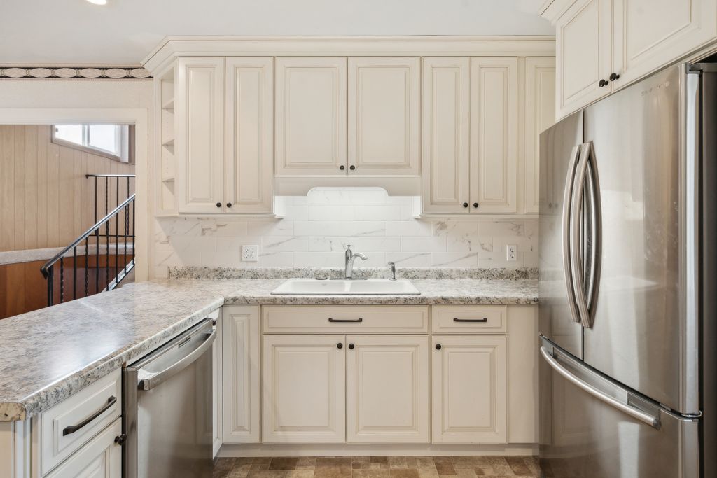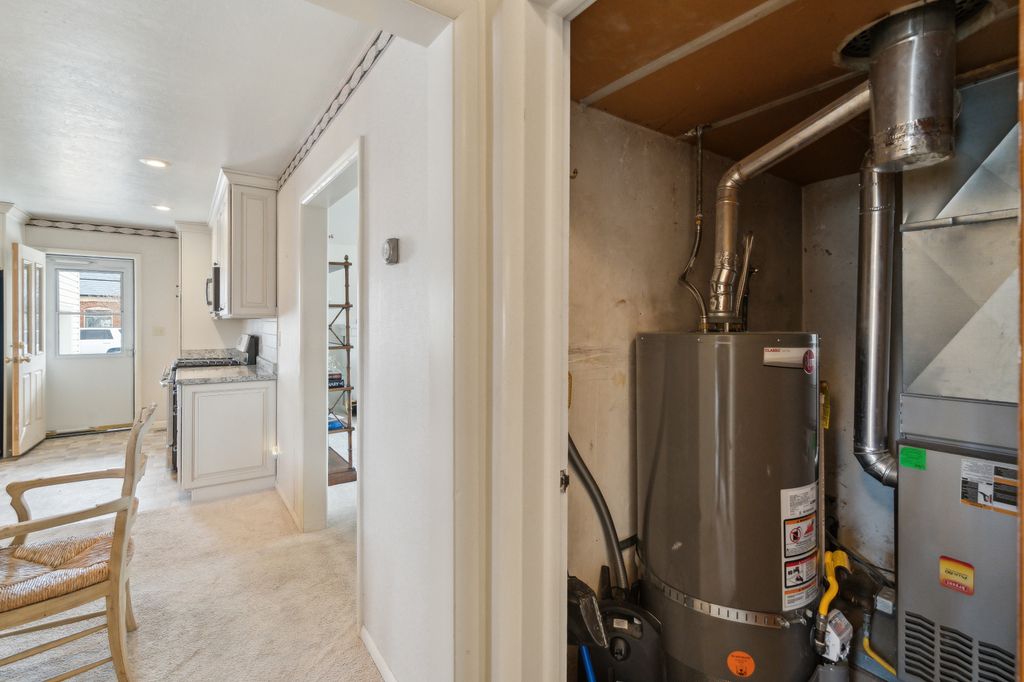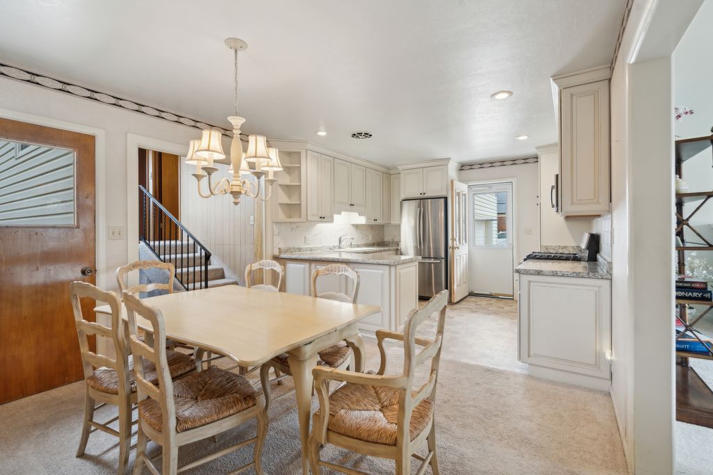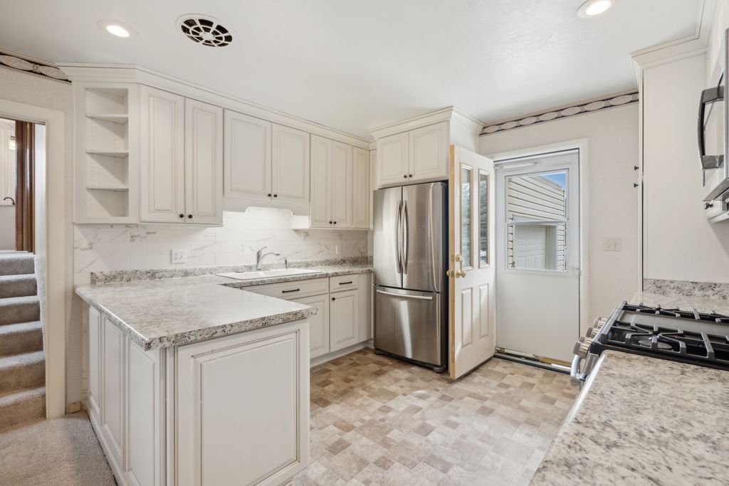 Attached garage with heat kitchen remodel in 2021 featuring gas stove and stainless steel appliances.
