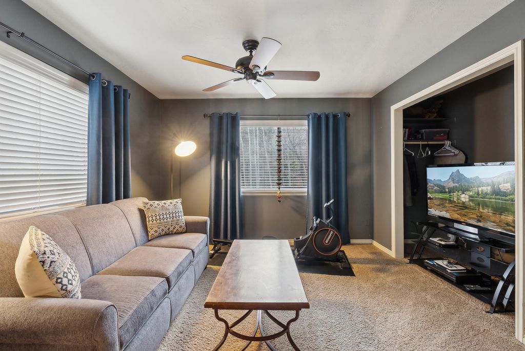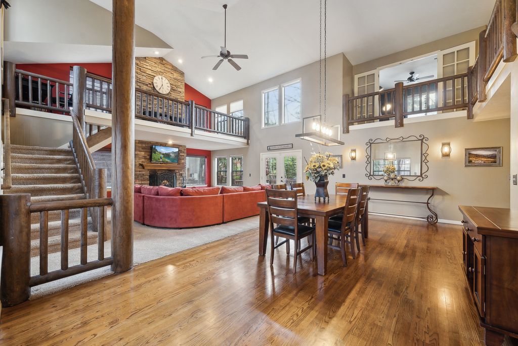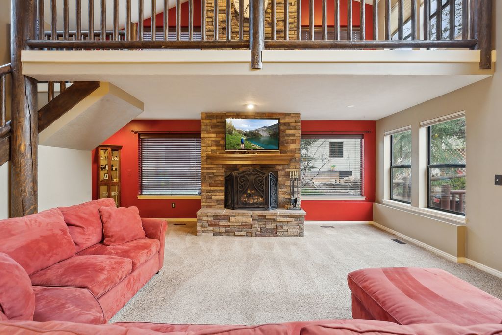 This fantastic Silver Springs home sits on a large, private lot fully landscaped with a year-round stream. The home features main floor living including a great room with 30 foot ceilings, a large fireplace and floor-to-ceiling windows opening to the beautiful trees. The primary bedroom is also on the main floor with a private fireplace, a large bathroom and a walk-in closet. There's a loft area off of the living room perfect for an office or additional living space. Upstairs you'll find three more spacious bedrooms perfect for guests and family. The yard is exceptionally large and is tiered with berms for privacy. There's a large stone fireplace in the yard perfect for evenings outside. This home is in a great Park City neighborhood and location close to the slopes and all Park City restaurants and fun.